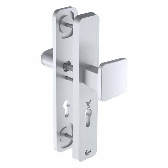 De buitenplaat is extra stevig uitgevoerd: het buitenschild wordt met 9 schroeven vastgezet in plaats van de traditionele 3. Dat maakt het beslag aanzienlijk sterker en moeilijker te forceren.